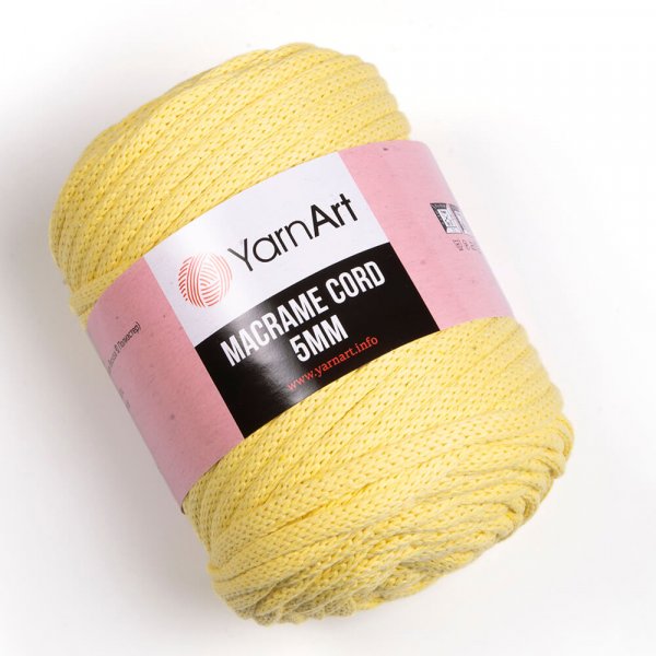 Macrame Cord 5mm. Novinka od YarnArt! Bavlněné šňůry Macrame Cord 5mm jsou krásně tkané, velmi jemné a hladké na omak. Díky přídavku polyesteru získávají šňůry výrobce YarnArt prvotřídní kvalitu a odolnost. Tato příze je ideální k háčkování či pro výrobu například pufů, koberců, podložek, prostírání, košů, košíčků, obalů, batohů, tašek a kabelek a mnoho dalších skvostných doplňků jak módních, tak do domácnosti. Tato příze je atestována TZÚ pro děti do 3 let.